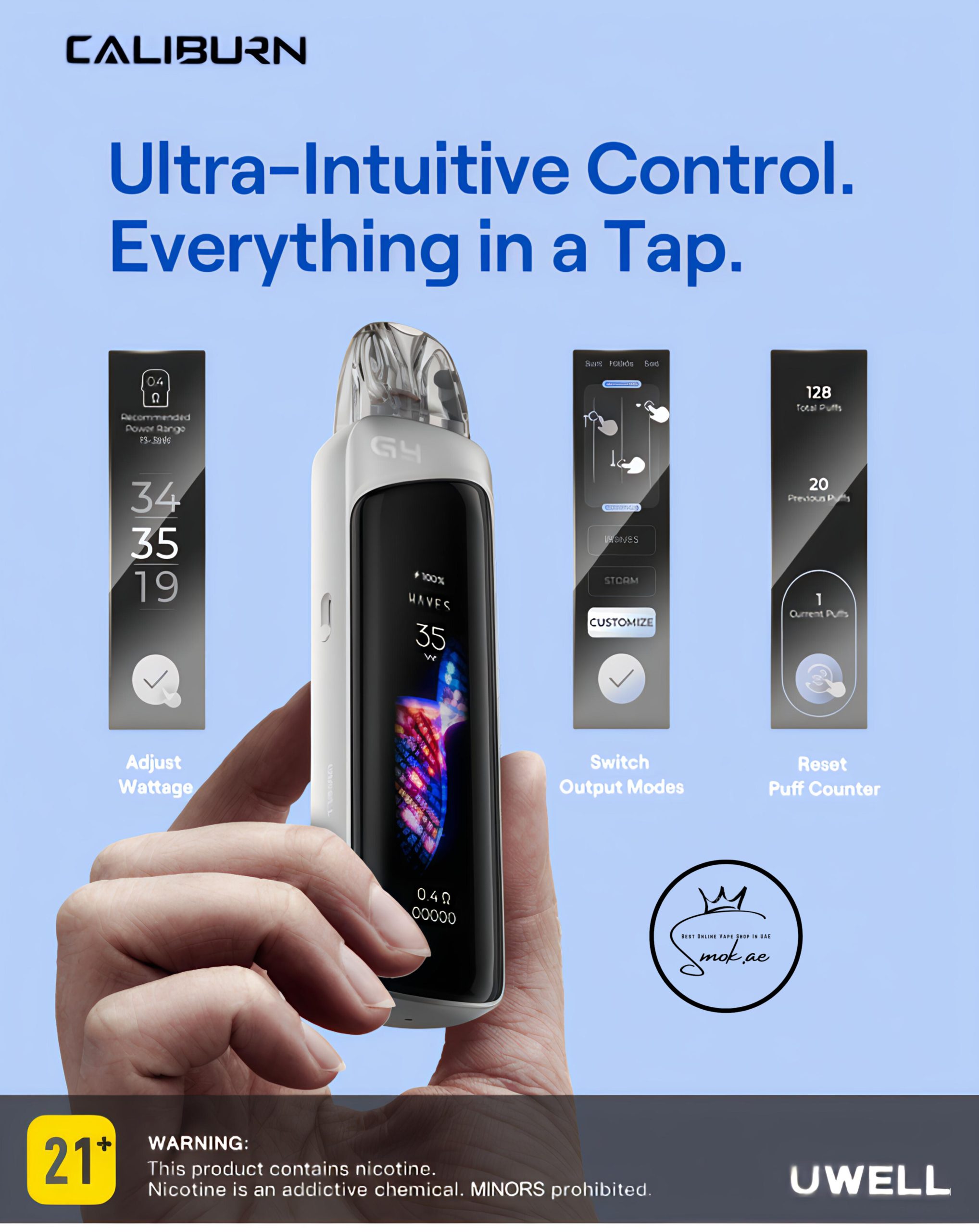 this Caliburn G4 Pro Vape Kit introduces a groundbreaking 2.51-inch ultra-shatterproof touchscreen that gives you complete control at your fingertips. From smart modes like Storm, Waves, and Custom to stepless airflow and real-time wattage adjustments, everything is customizable for your perfect vape.