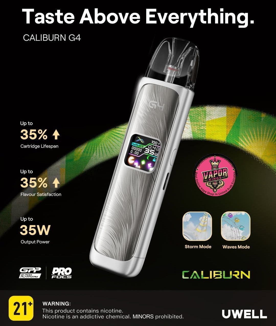 Caliburn G4 featuring dual vaping modes and an upgraded GPP Cartridge for unbeatable flavor and leak-resistant performance. Dual Vaping Modes- Storm Mode for instant intensity or Waves Mode for smooth, steady draws. Long-Lasting 1300mAh Battery- Supports extended vaping sessions with fast charging. Upgraded GPP Cartridge-Ultrasonic welding for anti-leak performance & U-shaped airflow for richer flavor. 0.85″ HD Color Screen-Monitor settings at a glance for a smarter vaping experience. Adjustable Airflow Control- Fine-tune your draw for the perfect hit. High-Performance Coils- Includes 0.4 ohm & 0.9 ohm meshed coils for versatile vaping styles. Premium Build- Durable aluminum alloy & PCTG construction in 8 stylish colors.